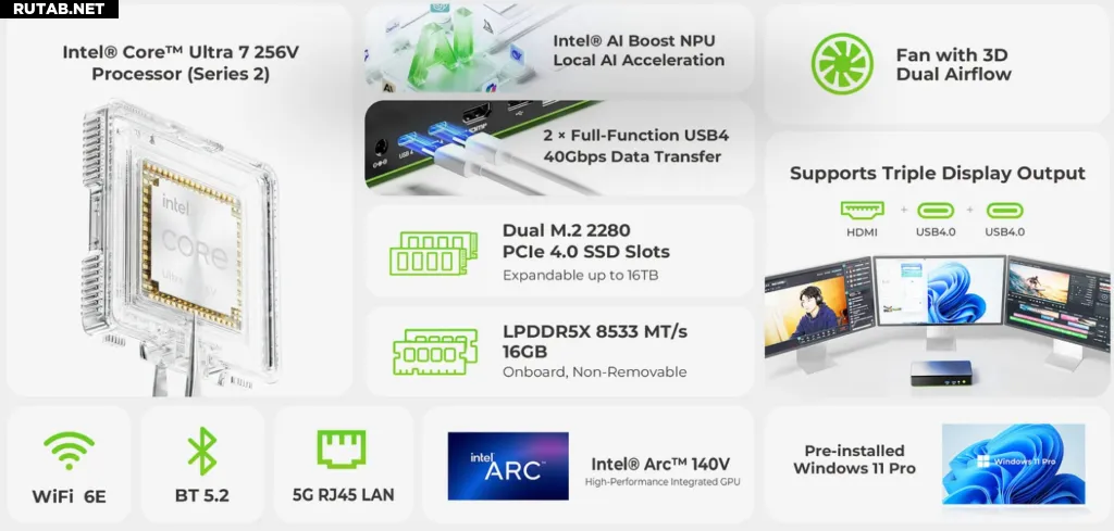 NucBox K13 оснащён чипом Intel Core Ultra 7 256V, созданным по 3-нм техпроцессу TSMC N3B. Он имеет 8 ядер, 8 потоков и тактовую частоту до 4,8 ГГц. Система включает в себя графический процессор Arc 140V с производительностью 64 TOPS и NPU Intel AI Boost на 47 TOPS, что обеспечивает совокупную пиковую производительность для вычислений ИИ в 115 TOPS (INT8). Такая конфигурация поддерживает продвинутый локальный AI-инференс, делая K13 подходящим для задач автоматизации рабочих процессов, творческой обработки и многозадачности.