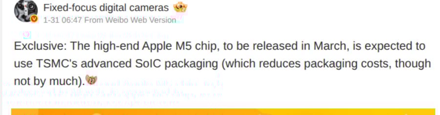 Согласно инсайдеру Fixed-focus digital с Weibo, Apple может, наконец, представить M5 Pro и M5 Max примерно через месяц. Слух не даёт чёткого объяснения, почему эти чипы задерживаются, особенно на фоне разговоров о том, что линейка M6 может выйти раньше, чем ожидалось ранее.