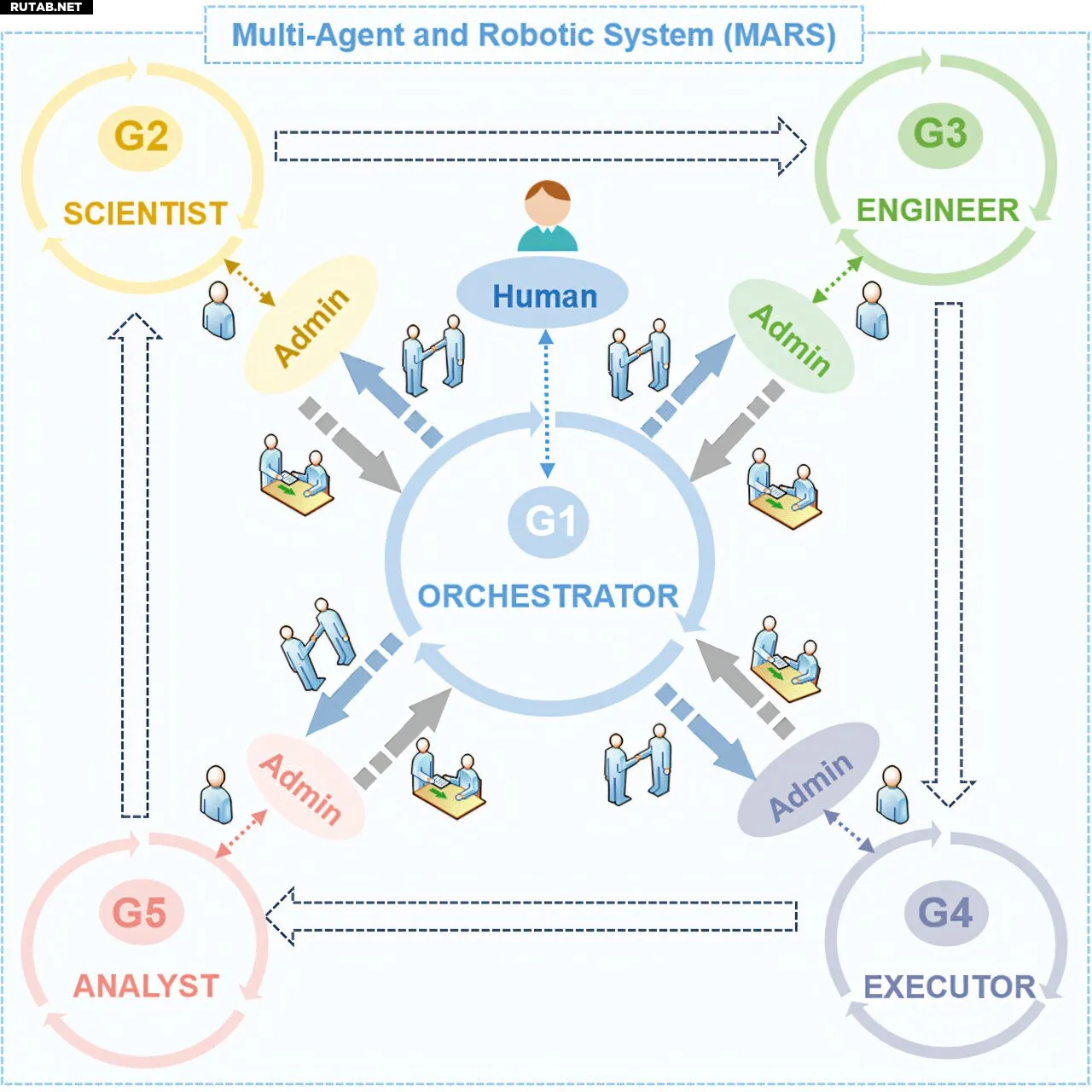 Группы включают Оркестратора для координации задач; Группу учёных для поиска знаний и проектирования решений; Группу инженеров, которая переводит проекты в исполняемые протоколы; Группу исполнителей, управляющих роботизированными платформами; и Группу аналитиков для интерпретации данных и разработки стратегий оптимизации.