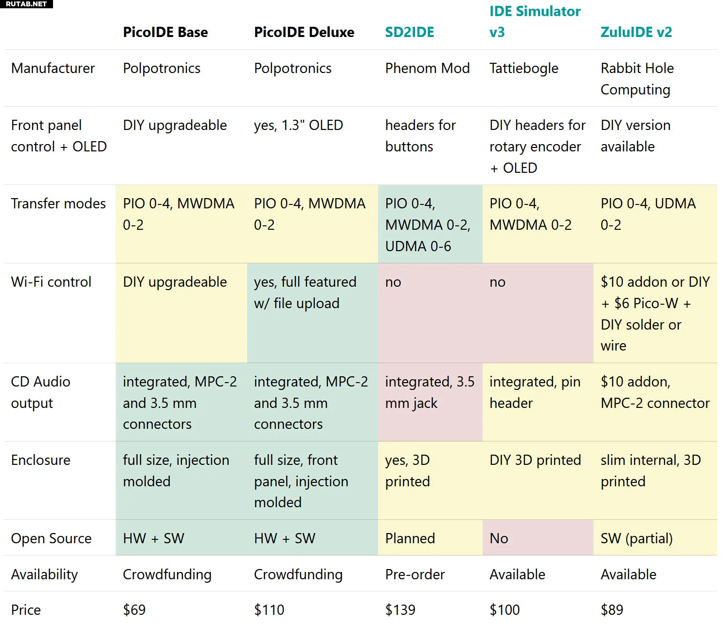 Предлагаются две версии устройства: PicoIDE Base ($69, ~5500 руб., бежевый) и PicoIDE Deluxe ($110, ~8800 руб., бежевый или чёрный). В любой комплектации пользователь получает следующие возможности:
