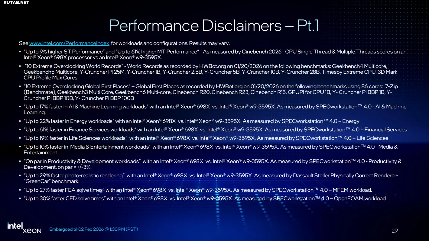 В тестах SPEC Workstation 4 флагманский Xeon 698X, по заявлениям Intel, демонстрирует прирост производительности до 61% в задачах финансового сектора и до 22% в энергоэффективности по сравнению с Xeon w9-3595X. В рендеринге Blender Junkshop прирост составил 74%, а в AI-апскейлинге видео с помощью Topaz Labs — 29%.