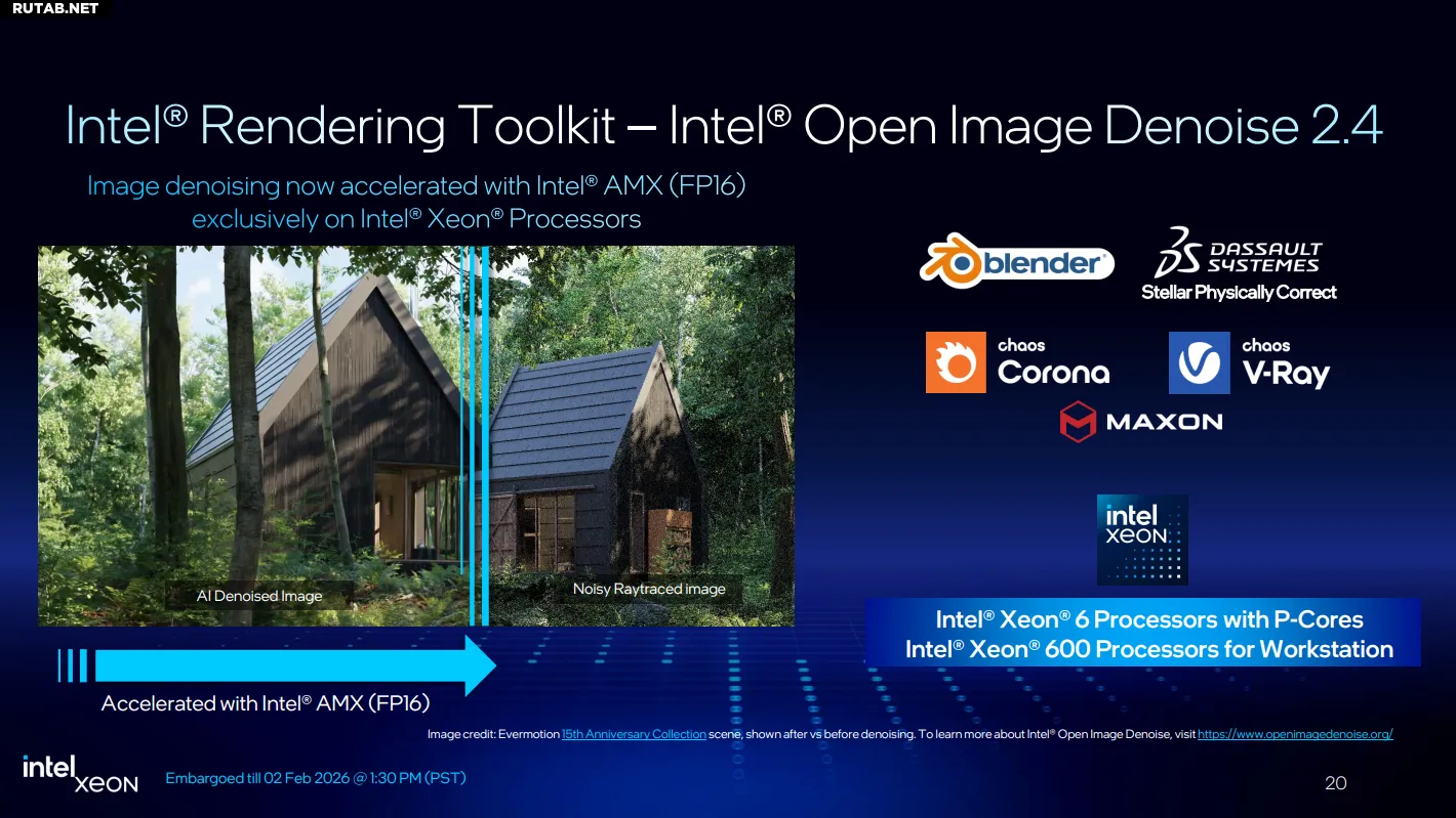 В процессорах также присутствуют AI-ускорители AMX, которые теперь поддерживают инструкции FP16. Intel анонсировала Open Image Denoise 2.4, оптимизированный под эти возможности.
