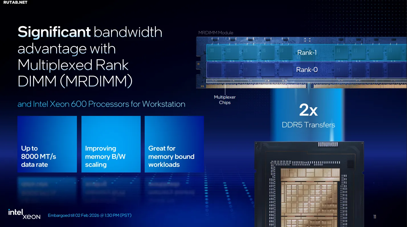 Платформа предлагает расширенные возможности: восьмиканальную память с официальной поддержкой до 6400 MT/s, 128 линий PCIe 5.0, поддержку CXL 2.0 и до 4 ТБ оперативной памяти. Впервые для рабочих станций Intel добавляет поддержку модулей памяти MRDIMM с пропускной способностью до 8000 MT/s, доступную для пяти топовых моделей, начиная с Xeon 674X.