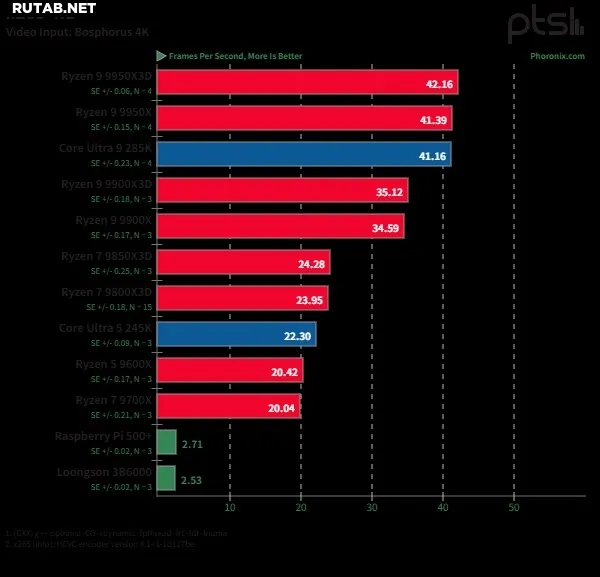 В других дисциплинах, таких как кодирование видео (x265, Kvazaar) и шифрование (OpenSSL), производительность 3B6000 была скромнее, что во многом связано с отсутствием низкоуровневой оптимизации кода под архитектуру LoongArch. В научных симуляциях (QuantLib, QMCPACK) чип продемонстрировал стабильную многопоточную производительность, превосходящую многие решения на RISC-V. Однако в однопоточных задачах, например при выполнении скриптов Python, его производительность составляет лишь около трети от Ryzen 5 9600X.