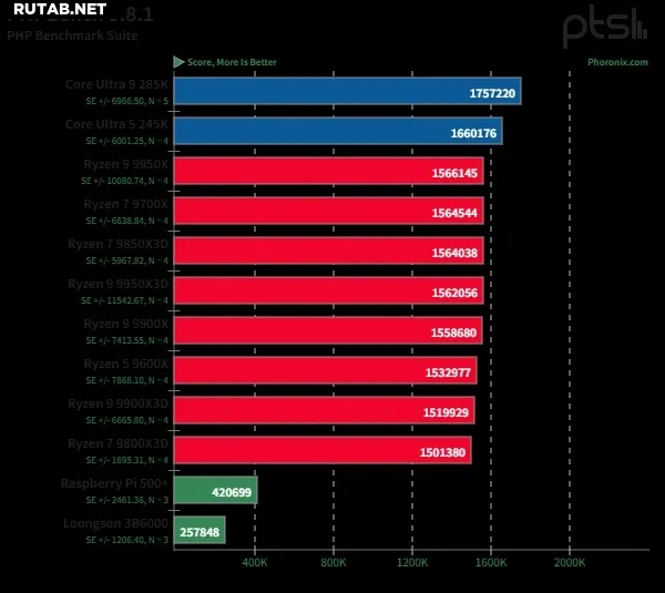 В задачах компиляции кода (Erlang, PHP, ImageMagick) 3B6000, как и ожидалось, отставал от флагманских x86-решений из-за более низких тактовых частот и пропускной способности памяти DDR4, но при этом значительно, примерно в 2.5 раза, опережал Raspberry Pi 5.