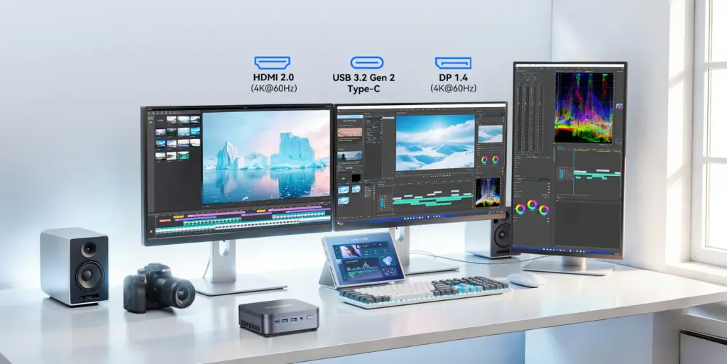Система поддерживает одновременный вывод изображения на три дисплея 4K через порты HDMI 2.0, DisplayPort 1.4 и USB-C с поддержкой режима DisplayPort Alt Mode.