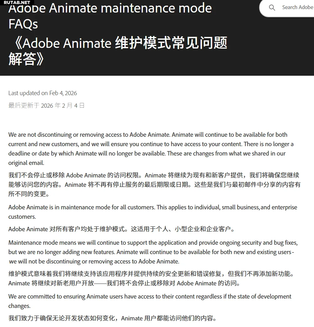 В новом заявлении Adobe говорится, что предыдущее уведомление пользователей о том, что 1 марта 2027 года станет «последним днём использования», аннулировано. Компания больше не устанавливает никаких сроков для прекращения обслуживания или удаления продукта. Adobe Animate останется доступен как для существующих, так и для новых пользователей.