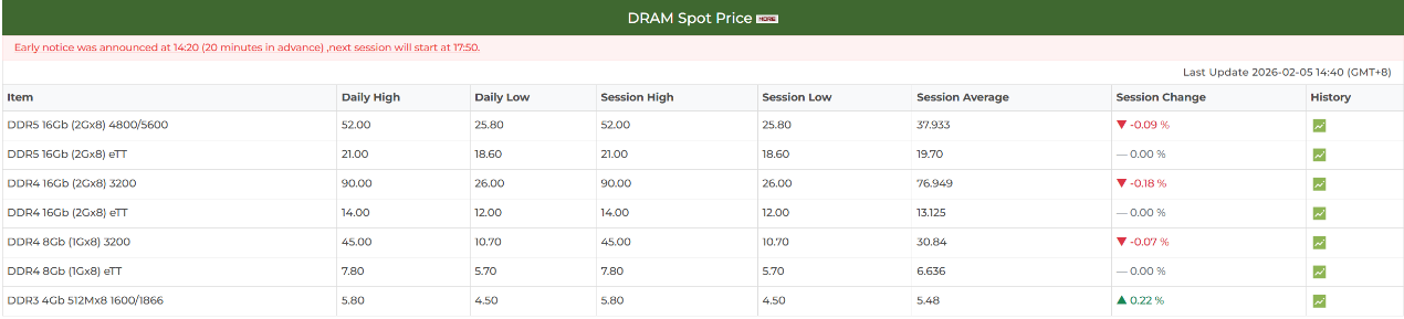 В своём последнем отчёте о тенденциях на рынке памяти TrendForce отмечает, что текущие спотовые цены на DRAM всё ещё значительно превышают средние контрактные. Ожидается, что новая волна роста на спотовом рынке может начаться только после объявления контрактных цен во второй половине февраля, когда станет ясна дальнейшая динамика.