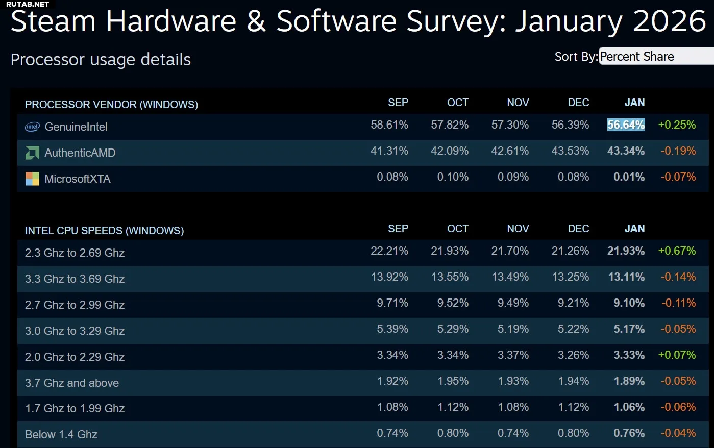Данные за январь показывают, что доля Intel на платформе Steam, после нескольких месяцев стабильного снижения, вернулась к отметке 56,64%, увеличившись на 0,25 процентного пункта по сравнению с предыдущим месяцем. Доля AMD, в свою очередь, незначительно сократилась на 0,19 п.п.