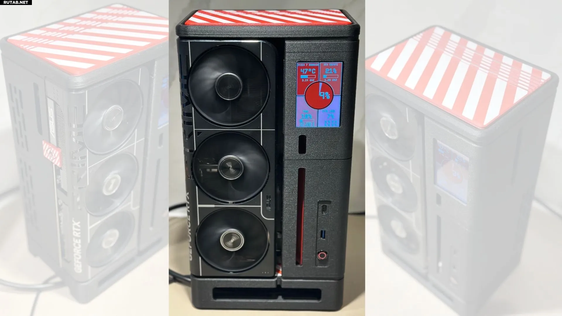 Габариты готового корпуса составили примерно 22.2 x 14.6 x 36.8 см, а его объём увеличился до 11.9 литров (против 9.8 у оригинала), чтобы вместить более крупную RTX 5070 Ti. В сборку также интегрирован небольшой внешний монитор для мониторинга системы.