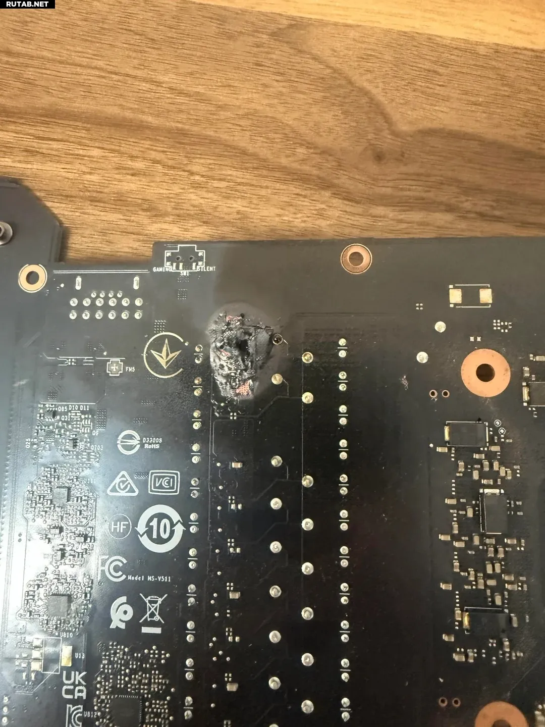 По словам владельца, сразу после установки карты в тестовый стенд графический процессор практически мгновенно начал «извергать пламя». На фотографиях, сделанных после разборки, видно, что замыкание произошло в области цепи питания VRM. Участок печатной платы рядом с 16-контактным разъёмом питания 12VHPWR был серьёзно обуглен.
