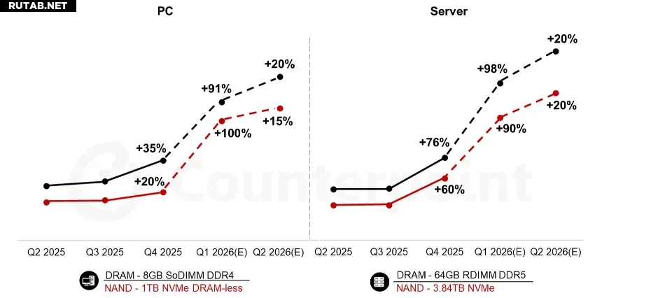 Цены на оперативную память (DRAM) и флеш-память (NAND) продолжают демонстрировать стремительный рост. Согласно данным аналитического агентства Counterpoint, в первом квартале 2026 года цены на память выросли на 80-90% по сравнению с предыдущим кварталом, что стало новым рекордом.