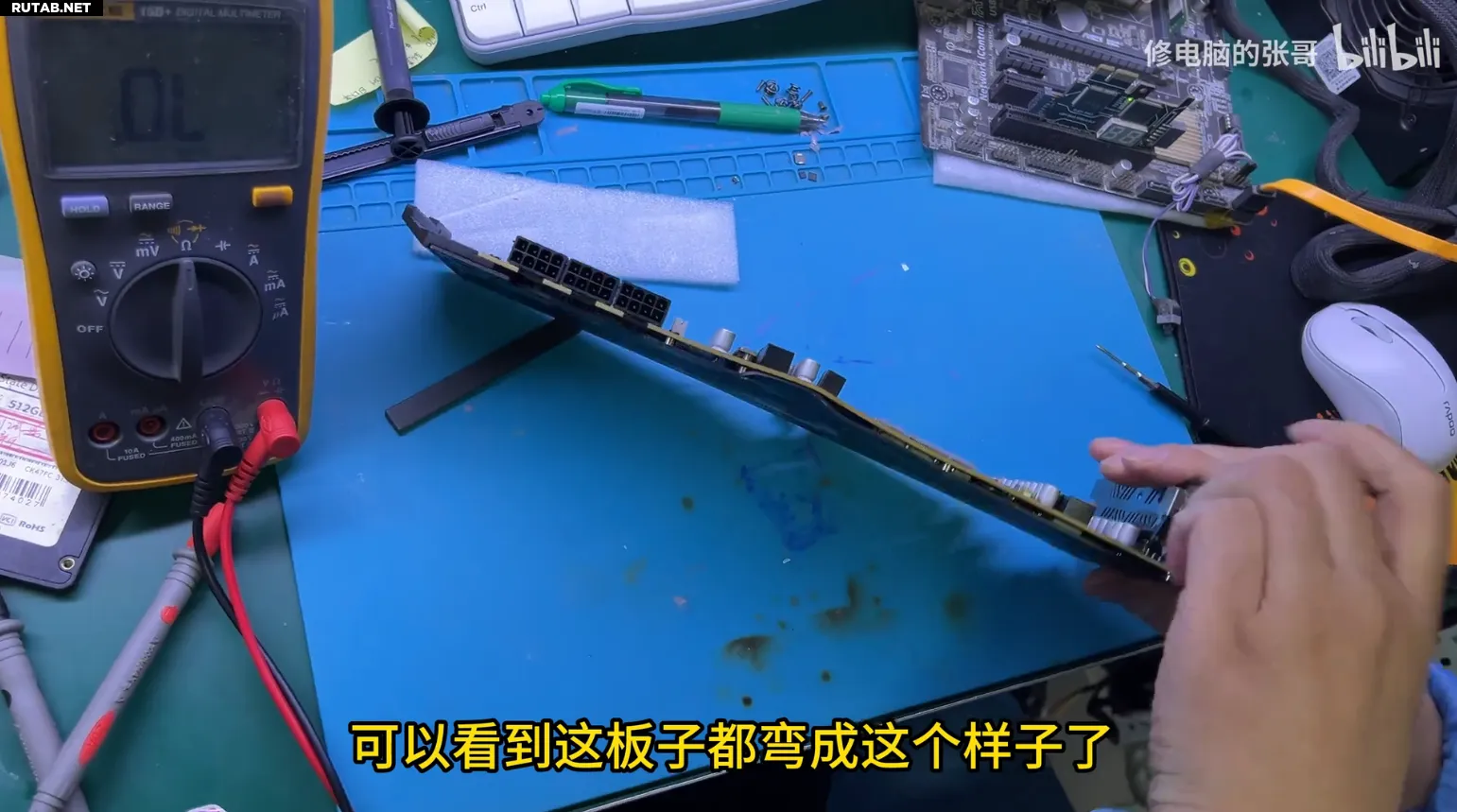 Из видео разборки видно, что печатная плата (PCB) карты серьёзно деформирована и имеет явные трещины. Диагностика показала, что из-за физического воздействия сгорели компоненты в цепи питания видеопамяти, а на одном из MOSFET-транзисторов даже образовалась микроскопическая вмятина.