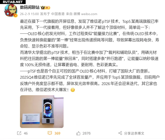 По данным инсайдера «Цифровой перерыв на чай», один из флагманских смартфонов от ведущего производителя (топ-5) первым оснастили экраном с технологией pTSF от китайской компании Visionox (维信诺).