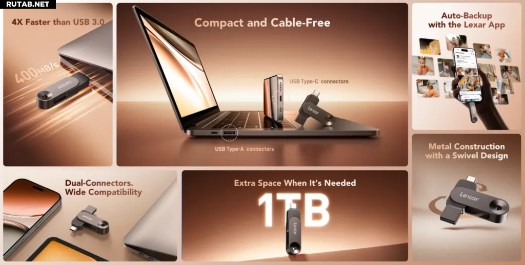 Двойная конструкция разъёмов позволяет легко переносить файлы между устройствами без переходников. По словам Lexar, версия на 1 ТБ может хранить более 300 000 фотографий, 18 000 минут HD-видео или более 110 000 песен.