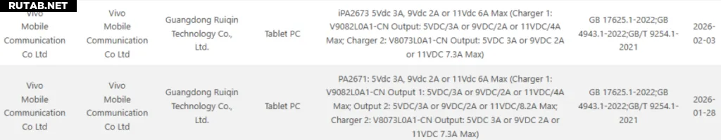 Как видно выше, два новых планшета с модельными номерами iPA2673 и PA2671 получили одобрение от органа по сертификации 3C в Китае. Это могут быть предстоящие iQOO Pad 6 Pro и Vivo Pad 6 Pro соответственно. В то время как устройство iQOO было замечено с блоком питания, поддерживающим зарядку мощностью до 80 Вт, адаптер питания Vivo Pad 6 Pro поддерживает зарядку до 90 Вт.