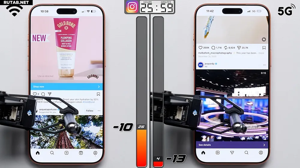 Затем последовал 16-часовой тест в режиме ожидания, где оба устройства показали одинаковые результаты. Однако при использовании Instagram в течение двух часов 5G снова начал проигрывать, израсходовав примерно на 3% больше энергии. К этому моменту у смартфона на 5G оставалось всего 4% заряда, в то время как у версии на Wi-Fi — целых 26%.