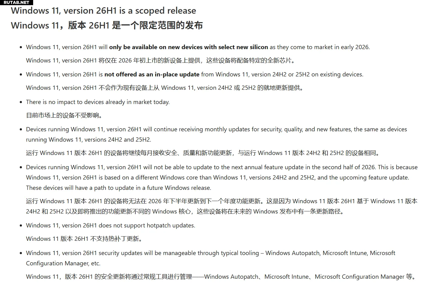 Поскольку Windows 11 26H1 предполагает изменения на уровне архитектуры, существующие устройства на Windows 11 24H2 или 25H2 не смогут выполнить обновление на месте до версии 26H1. Устройства, работающие на 26H1, также не смогут напрямую обновиться до 26H2.
