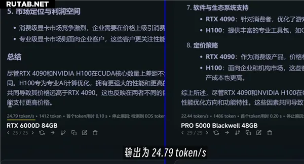 Например, в тесте большой языковой модели DeepSeek R1 70B в LMStudio с длиной контекста 8000 токенов, RTX 6000D тратит на «размышление» всего 13 секунд, а скорость генерации текста составляет 24.79 токенов в секунду, что более чем на 10% быстрее RTX PRO 5000.