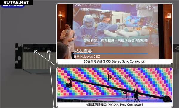 На верхней грани расположены четырёхконтактный интерфейс для 3D-стереосинхронизации и разъём для синхронизации кадров (Frame Lock/Genlock), а с торца — 16-контактный разъём питания.