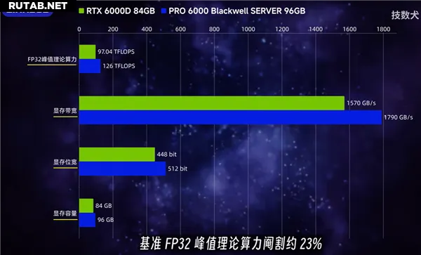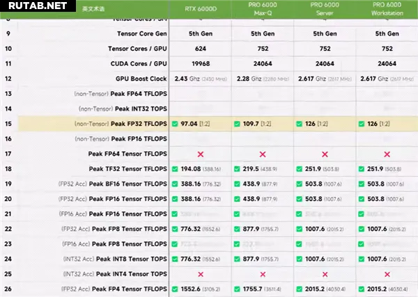 В итоге вычислительная производительность RTX 6000D снизилась примерно на 23%. Например, производительность в точности FP32 составляет около 97.04 TFLOPS, что даже меньше, чем у версии RTX PRO 6000 Max-Q.
