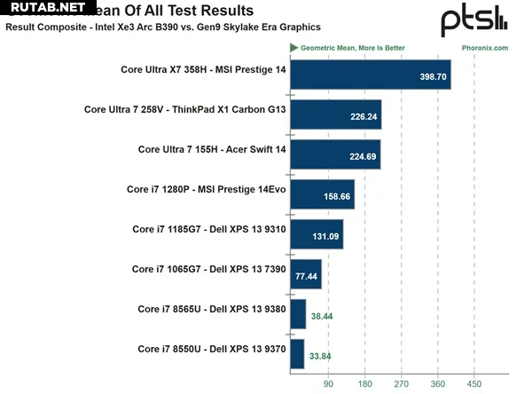 Сводные результаты впечатляют: новая графика Arc B390 оказалась быстрее старой UHD 620 почти в 12 раз (в 11.97 раз точнее). Особенно значительный скачок производительности произошёл с выходом процессоров 10-го и 11-го поколений, которые удвоили показатели графики. Новейшая архитектура Panther Lake также демонстрирует прирост более чем на 75%.