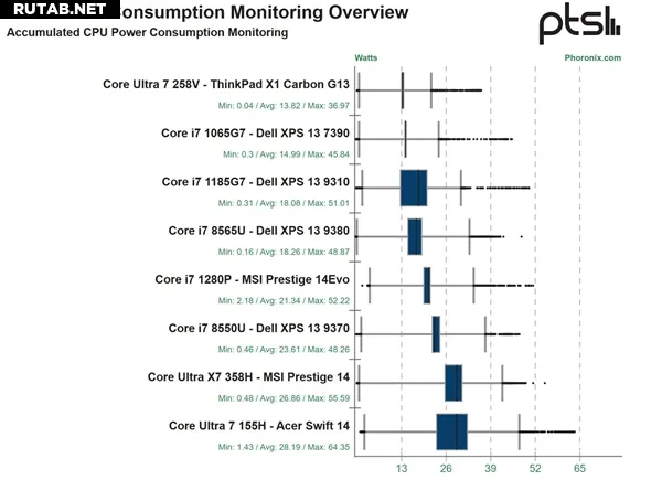 Помимо производительности, была измерена и энергоэффективность. Расчёты показывают, что по этому параметру современные решения превосходят 10-летние образцы в 8 раз. Самым экономичным оказался процессор Lunar Lake со средним энергопотреблением всего 13.82 Вт и пиковым около 37 Вт. Мощный Panther Lake также показал отличный контроль над энергопотреблением: в среднем 26.8 Вт с максимумом около 56 Вт.