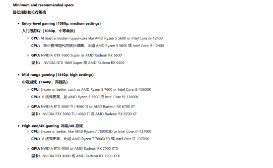 Согласно документу, для начального уровня подойдут процессоры уровня AMD Ryzen 5 5600 или Intel Core i5-12400 в паре с видеокартой типа NVIDIA GeForce GTX 1660. Средний уровень включает Ryzen 5 7600 и RTX 3060 Ti. Высокопроизводительная система, по мнению Microsoft, требует процессора уровня Ryzen 7 7800X3D и дискретной видеокарты уровня RTX 4080.