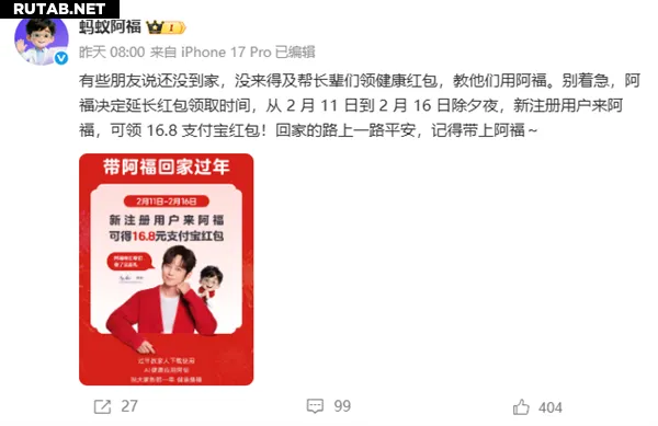 Компания Ant Financial объявила о продлении акции до кануна китайского Нового года, 16 февраля. С 11 по 16 февраля все вновь зарегистрированные пользователи смогут получить подарочный сертификат на ту же сумму.