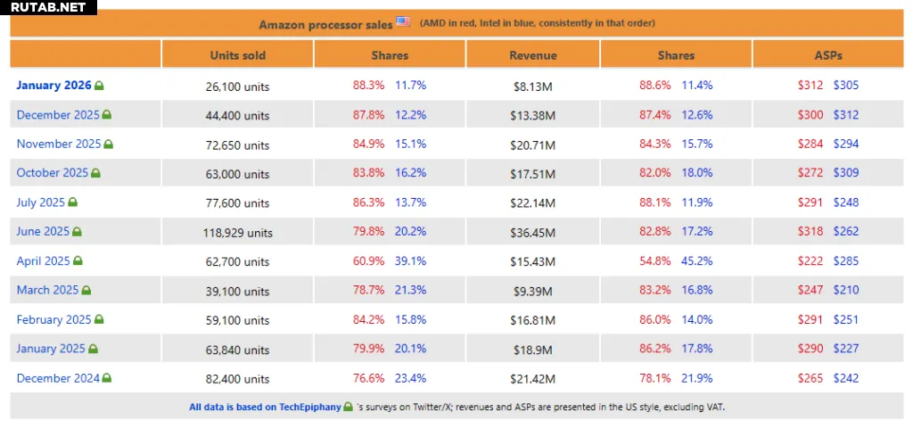 Новые данные о продажах процессоров на американском Amazon показывают резкое годовое падение в январе 2026 года. Согласно цифрам, собранным аналитиком TechEpiphany, за месяц было продано всего 26 100 процессоров. Само по себе это может звучать не так уж страшно, но это означает крутое падение на 51% по сравнению с январем 2025 года.