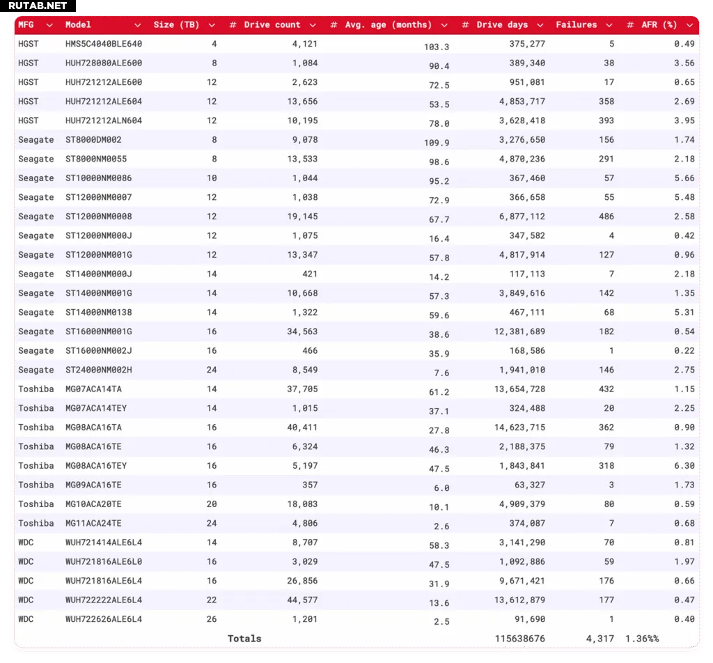 Согласно данным на сайте компании, её накопители суммарно отработали 115 638 676 дней, при этом вышло из строя 4 317 единиц. Статистика собрана на основе 344 196 дисков, что даёт репрезентативную выборку для оценки их надёжности.