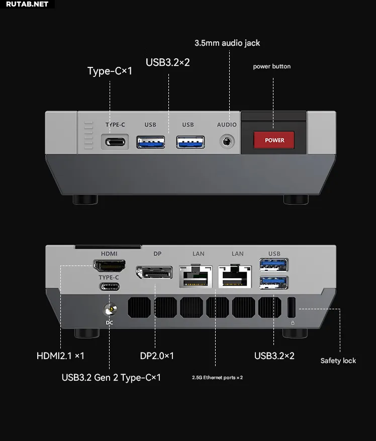 Из портов доступны один USB4 с поддержкой Power Delivery до 100 Вт, один USB 3.2 Gen 2 Type-C, два порта USB 3.2 Gen 2 Type-A и два порта USB 3.2 Gen 1 Type-A. Для вывода изображения есть HDMI 2.1 и DisplayPort 2.0, поддерживающие одновременное подключение до четырёх 8K-дисплеев. Сетевые возможности включают два порта Ethernet 2,5 Гбит/с, Wi-Fi 7 и Bluetooth 5.4, а также разъём для наушников 3,5 мм. Система поставляется с предустановленной Windows 11 Pro и поддерживает подключение внешних видеокарт через порт USB4.
