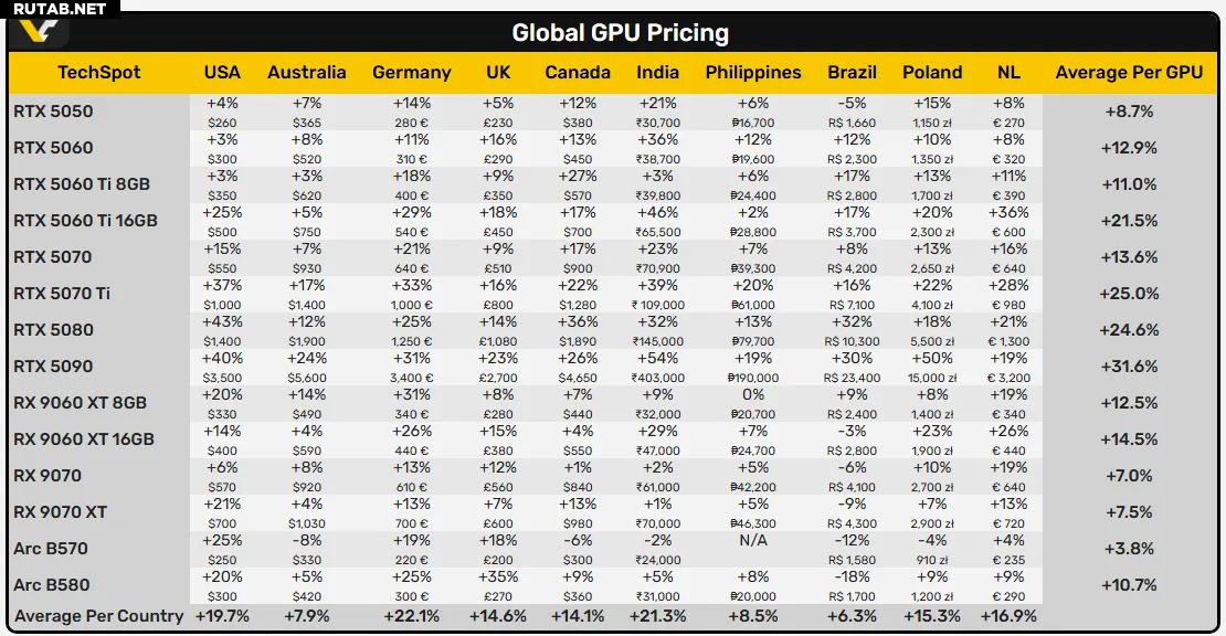 В этой волне подорожания флагманская RTX 5090, как и ожидалось, стала лидером роста. Её средняя цена в мире выросла на ошеломляющие 32%, а в некоторых регионах рост был ещё выше. Например, в Индии и Польше цены подскочили на 54% и 50% соответственно. Даже на рынке США, где предложение считается относительно стабильным, рост составил 40%, что превратило и без того дорогую топовую карту в своеобразный «инвестиционный актив».
