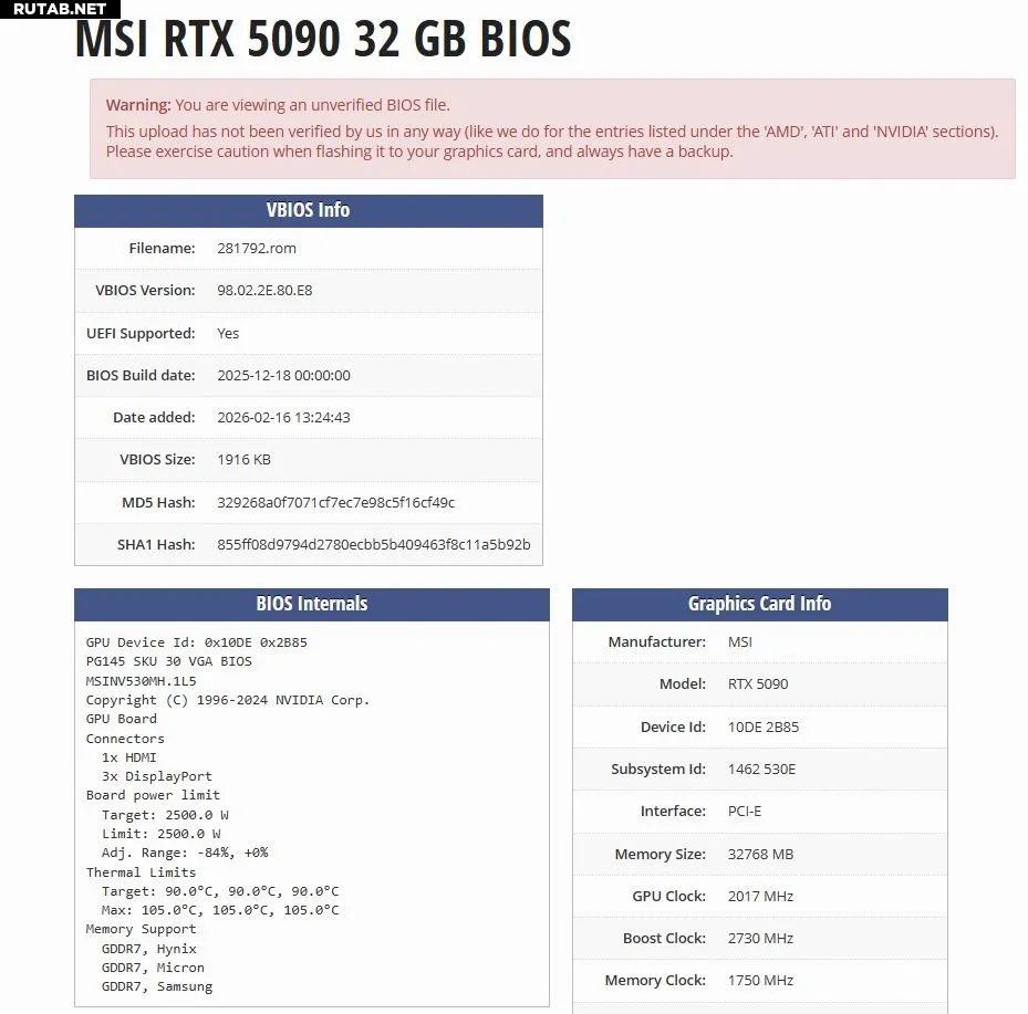 Утечка BIOS для RTX 5090 с лимитом мощности в 2500 Вт