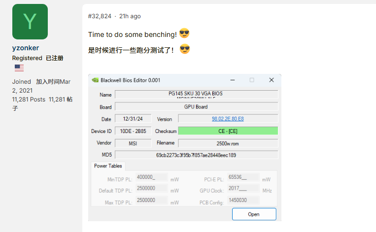После утечек конфигураций на 800 Вт и 1000 Вт, в сеть снова попал экстремальный BIOS для разгона флагманской видеокарты MSI RTX 5090 Lightning Z, поднимающий лимит энергопотребления до ошеломляющих 2500 Вт.