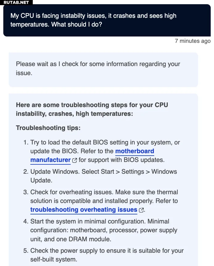 Редакторы ресурса Wccftech решили проверить эффективность этого решения на практике. Журналисты сообщили боту о неисправности, связанной с перегревом процессора и общей нестабильностью компьютера. Ассистент, как и ожидалось, отреагировал стандартной процедурой, основанной на внутренней базе знаний компании. Среди рекомендаций оказались обновление ПО материнской платы, проверка системы охлаждения и совет запустить стресс-тест. Предложение нагружающего теста для оборудования, которое и так уже имеет проблемы с отводом тепла, довольно ясно показывает, что алгоритмы не всегда способны логически интерпретировать серьёзность ситуации.