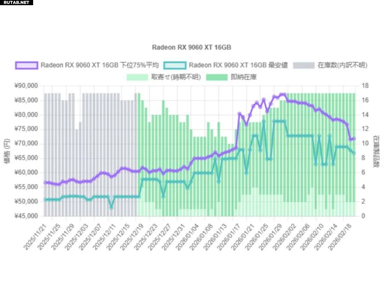 С ростом стоимости памяти производители начали перекладывать издержки на пользователей. К середине января минимальная цена на RX 9070 XT в Акихабаре поднялась примерно до 130000 иен, а средняя — до 144000 иен. Неожиданно это привело к резкому падению спроса, что вынудило местных ритейлеров снижать цены.