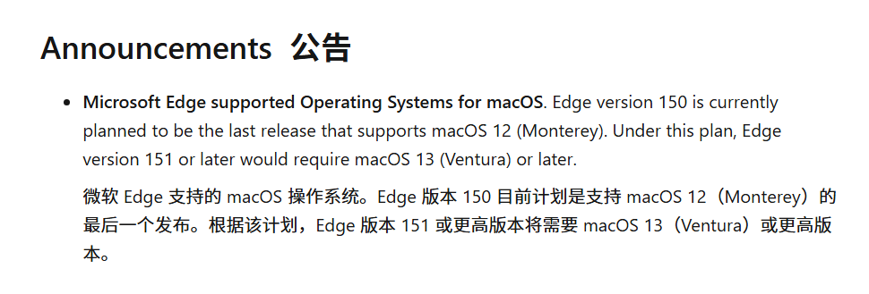 Согласно официальному объявлению, Edge 150 станет последней версией, поддерживающей macOS 12, и ожидается, что она будет выпущена в июне или июле. Начиная с Edge 151, минимальные системные требования будут повышены до macOS 13 Ventura.