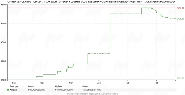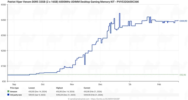 Один из пользователей отслеживал динамику цен на комплекты памяти DDR5 объемом 32 ГБ в Европе и опубликовал необычный график.