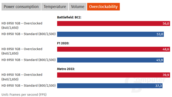 По сравнению с GeForce GTX 560 Ti преимущество даже 1 ГБ версии Radeon HD 6950 остаётся очевидным: она опережает конкурента на 5–18% в зависимости от сценария.