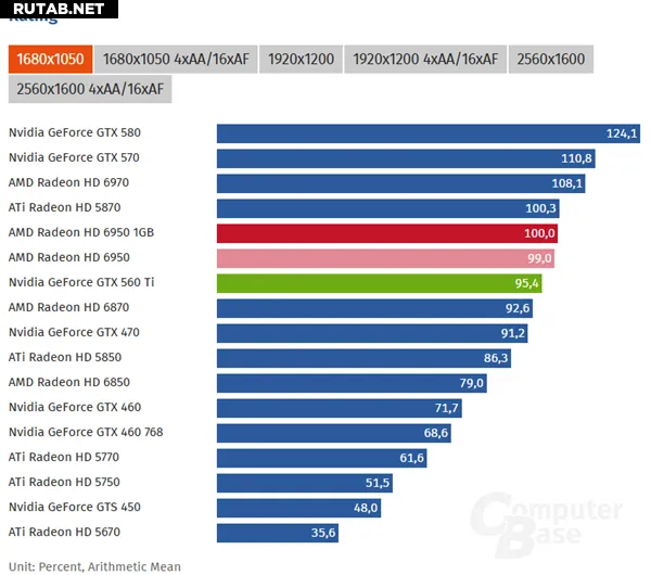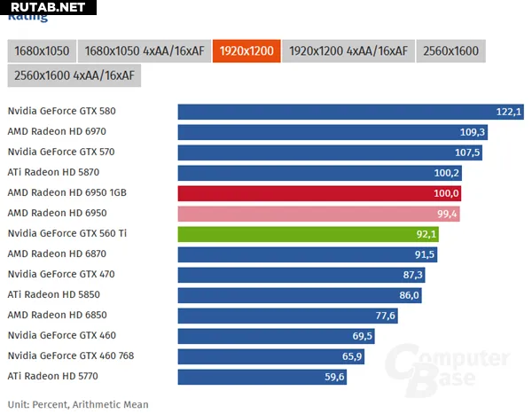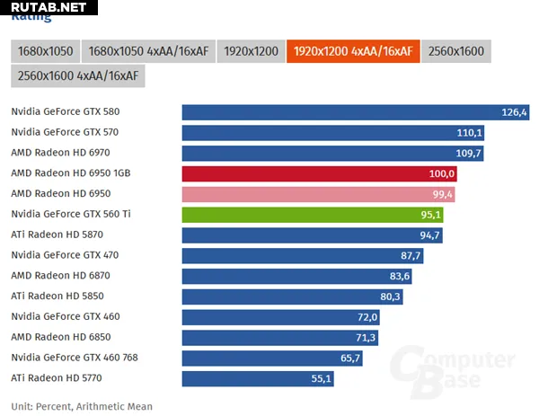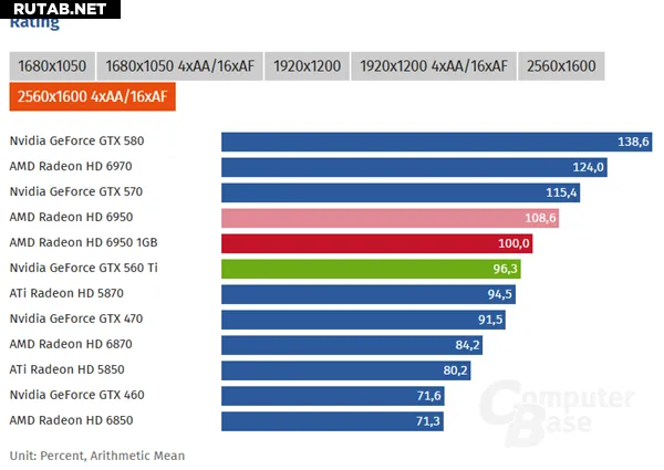В новом тестировании особое внимание уделили версии HD 6950 с урезанным до 1 ГБ объёмом видеопамяти. Интересно, что в большинстве игр и разрешений её производительность практически не отличалась от 2 ГБ модели. Существенный разрыв (около 9%) проявился только в разрешении 2K с включённым сглаживанием 4xAA и анизотропной фильтрацией 16xAF, где требовалось больше видеопамяти.