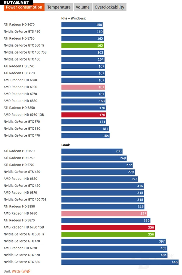 Что касается энергопотребления, то под нагрузкой обе карты — и Radeon, и GeForce — показывали схожие результаты, потребляя около 350 Вт. Для HD 6950 с её значительно большим чипом это можно считать хорошим результатом. Любопытно, что версия с 1 ГБ памяти не стала холоднее или тише 2 ГБ модели, а в некоторых случаях даже демонстрировала более высокие температуры и уровень шума. Возможная причина — более высокое рабочее напряжение.