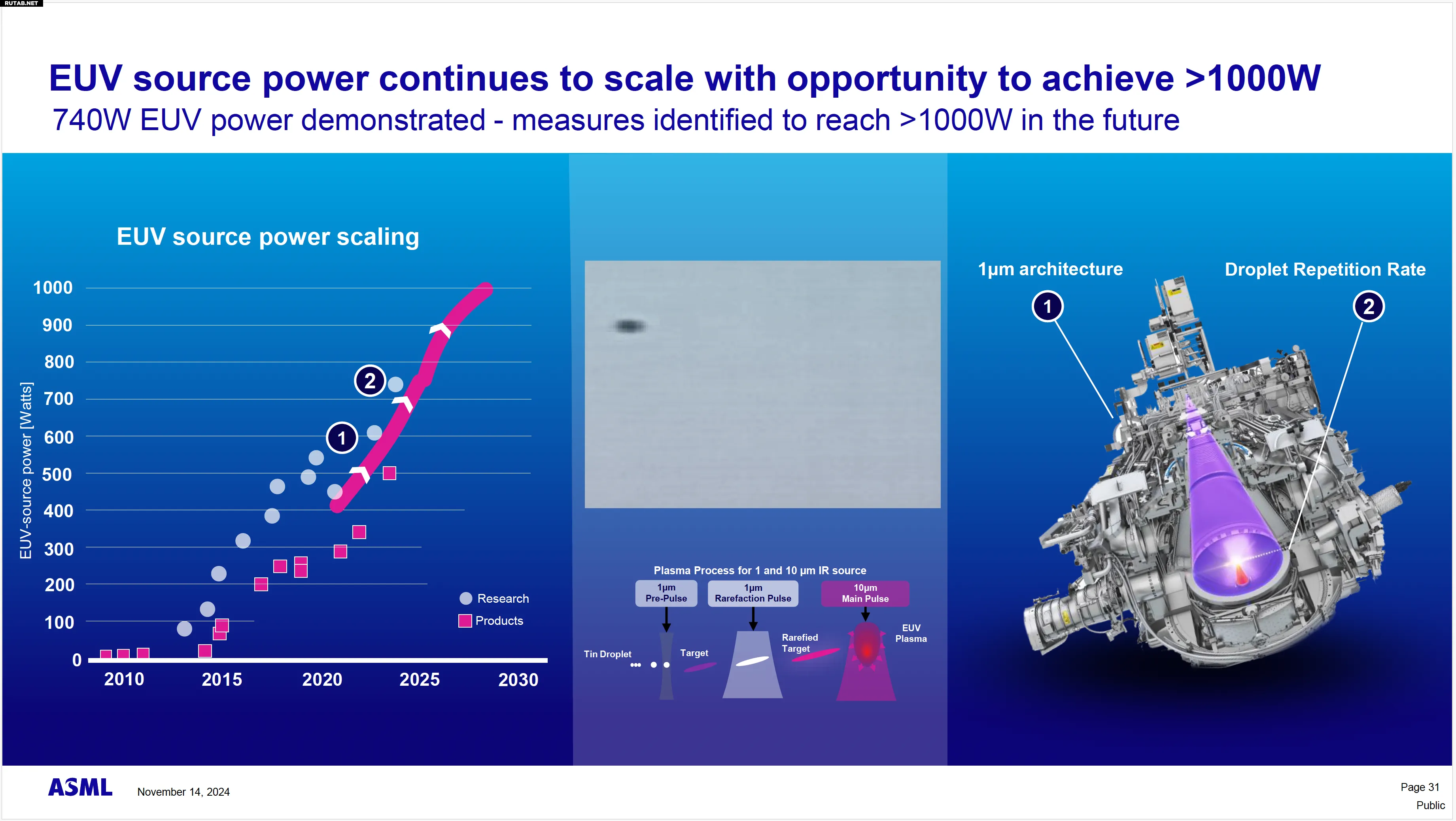 «То, что было достигнуто — один киловатт — это довольно удивительно», — заявил Майкл Пурвис, ведущий технолог ASML по источникам EUV-излучения, в интервью Reuters. — «Мы видим достаточно ясный путь к 1500 ваттам, и нет фундаментальных причин, почему мы не могли бы добраться до 2000 ватт».