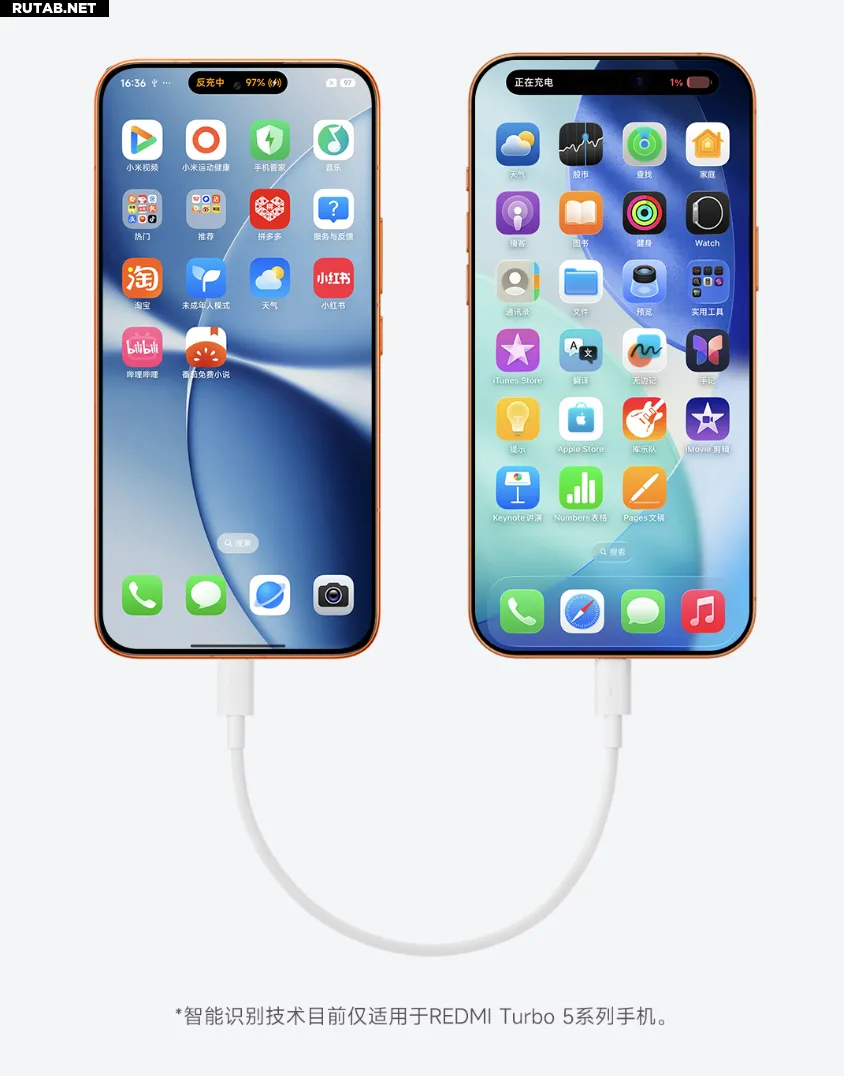 Xiaomi также нанесла на разъем стрелку, указывающую направление. При подключении других устройств или при обратной зарядке телефона направление стрелки можно игнорировать. Серия REDMI Turbo 5 поддерживает проводную автоматическую обратную зарядку и переключение направления зарядки.