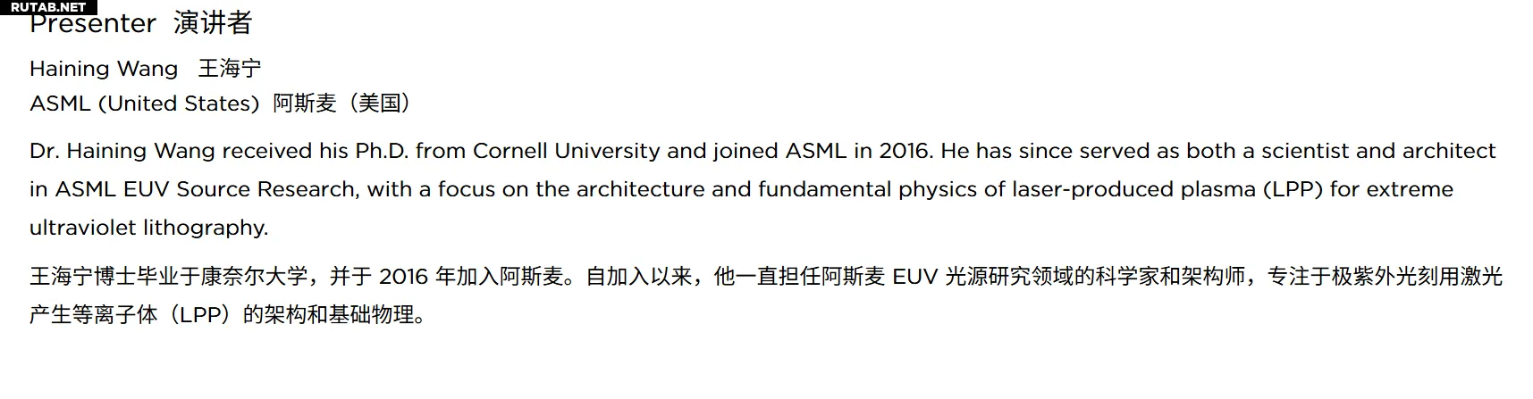 Согласно его резюме, более 20 лет назад он получил в Китае Национальную премию как выдающийся студент-иностранец, обучающийся за свой счет. В 2016 году он защитил докторскую диссертацию в Корнельском университете (США) и в том же году присоединился к ASML в качестве учёного и архитектора в отделе исследований EUV, где сосредоточился на фундаментальной физике процессов плазмы, используемой для генерации излучения.