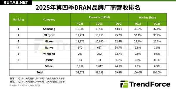 Согласно последнему отчёту аналитического агентства TrendForce, выручка мировой индустрии DRAM в четвёртом квартале 2025 года достигла 535,8 млрд долларов, увеличившись на 29,4% по сравнению с предыдущим кварталом и продолжив уверенный рост.
