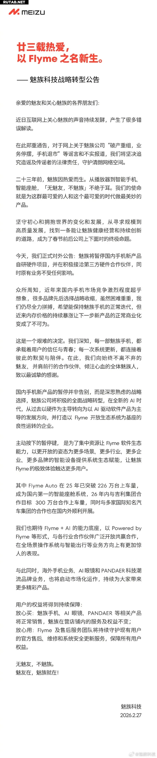Компания заявила, что в последние годы конкуренция на китайском рынке смартфонов стала невероятно жёсткой, и многие бренды уже перешли к стратегическому сокращению. Несмотря на огромные трудности, Meizu изо всех сил старалась поддерживать нормальный цикл обновления своих телефонов. Однако непрерывный резкий рост цен на память сделал нормальную коммерциализацию следующего поколения продуктов невозможной.