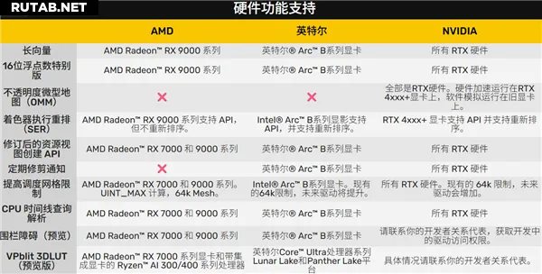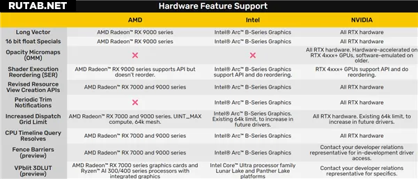 Поддержка уровней функций DX12 сильно различается в зависимости от GPU. Базовые функции SM 6.9, такие как длинные векторы и 16-битные числа с плавающей запятой, требуют: AMD RX 9000 серии, NVIDIA RTX серии, Intel Arc B серии.