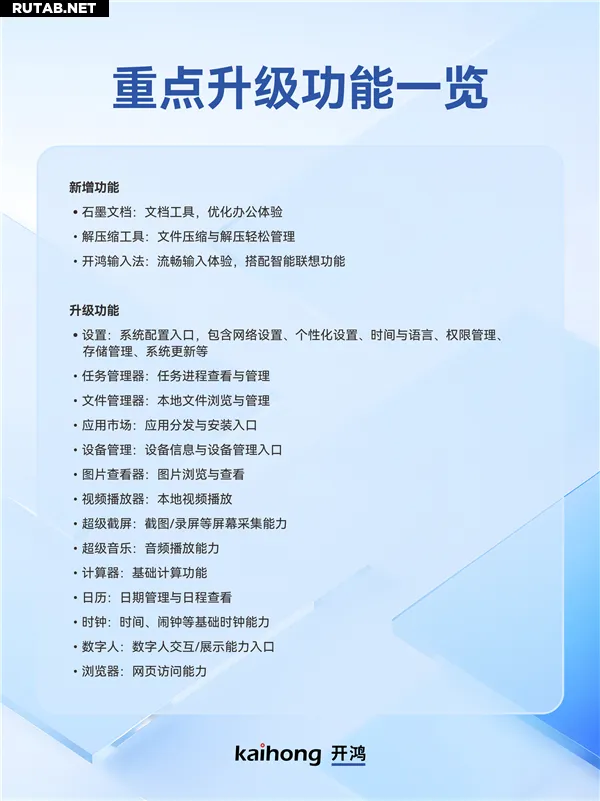 KaihongOS Standard System построена на технологической базе OpenHarmony и обладает такими возможностями, как ближнее обнаружение, распределённое взаимодействие, стандартные протоколы данных, безопасность и доверие, а также гибкое развёртывание. Система расширенно поддерживает полноценные звонки, управление файлами, браузер, беспроводное дублирование экрана и передачу аудио- и видеопотоков.