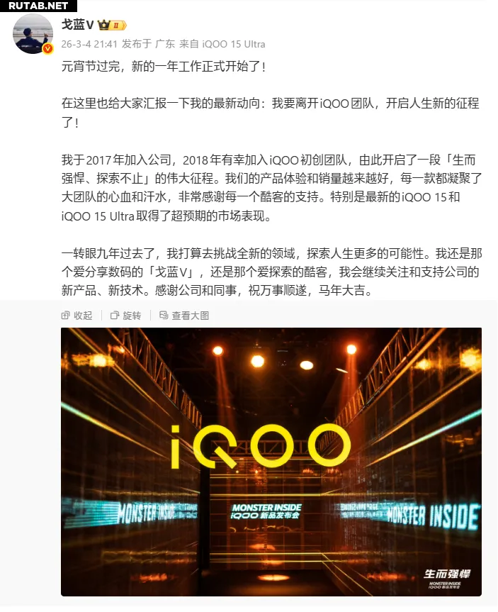 Директор по продуктам суббренда vivo — iQOO — Цзянь Чжун (также известный в соцсетях как Гэ Лань V) официально объявил о своём уходе из компании, чтобы начать «новую главу» в своей жизни.